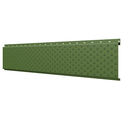 Линеарная потолочно-стеновая панель с ПЕРФОРАЦИЕЙ для вентиляции цвет RAL6002 Зеленый Лист применяется в качестве софитов для подшивы крыши, наружной и внутренней отделки потолков, стен, фронтонов фасада дома в Павлодаре.