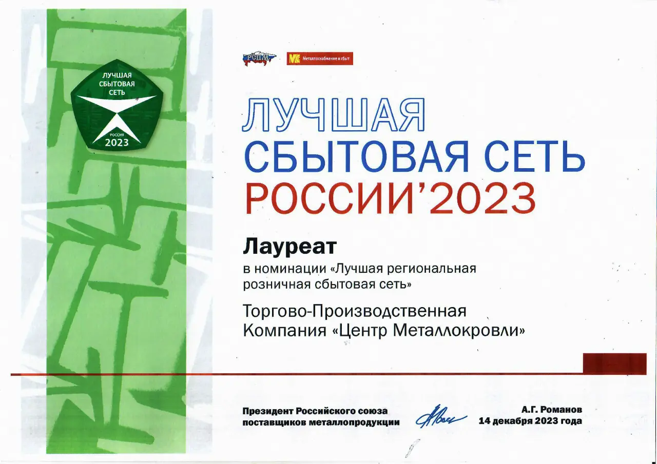 Диплом лауреата конкурса "Лучшая региональная розничная сбытовая сеть России 2023"