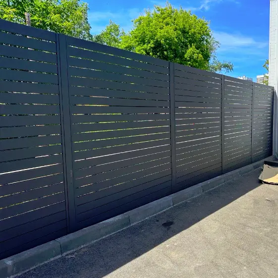 Элегантный горизонтальный секционный забор в стиле «ранчо», выполненный из металлического планкена в покрытии RAL 7024 MATTE Серый Графит. Матовая поверхность подчёркивает современный характер ограждения, а горизонтальные линии визуально расширяют пространство участка. Конструкция отличается прочностью, долговечностью и лаконичным внешним видом, успешно сочетая практичность и эстетичность. Такой забор гармонично вписывается в любой архитектурный ансамбль, придавая территории ухоженный и солидный облик.